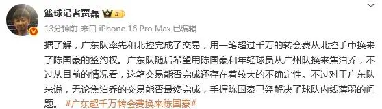 媒体人贾磊发文点评:据了解,广东队率先和北控完成了交易,用一笔超过千万的转会费从北控手中换来了陈国豪的签约权。